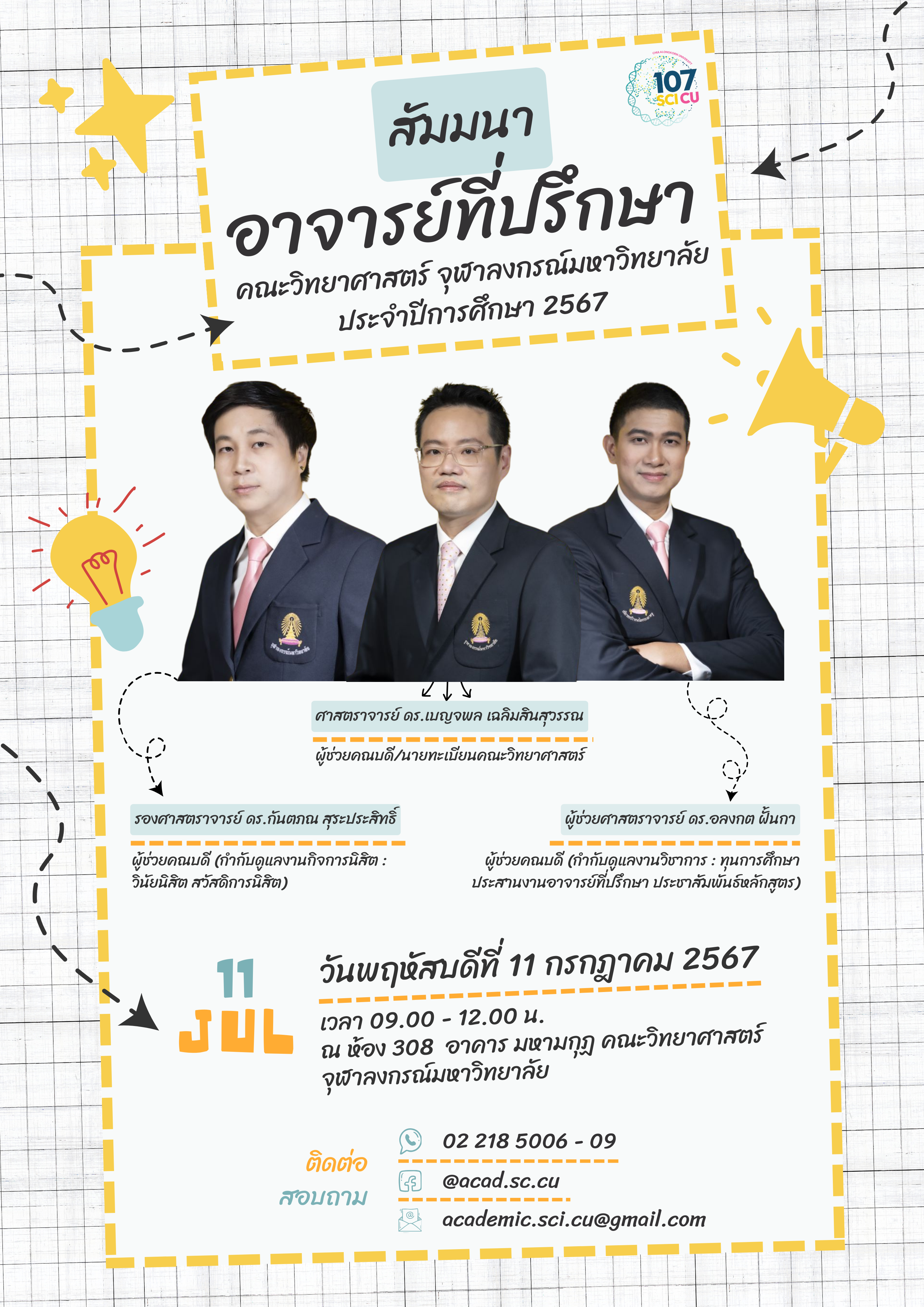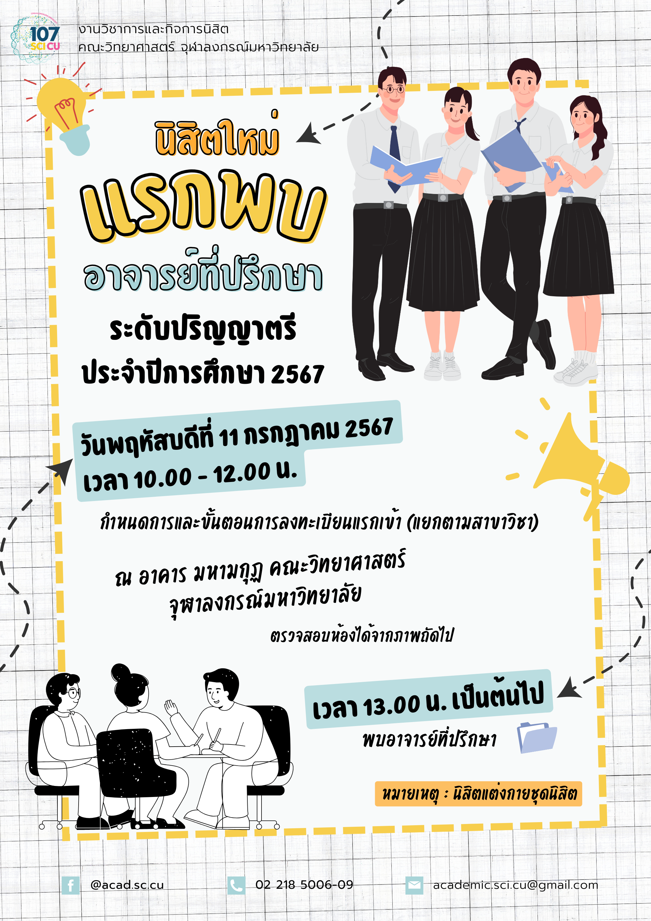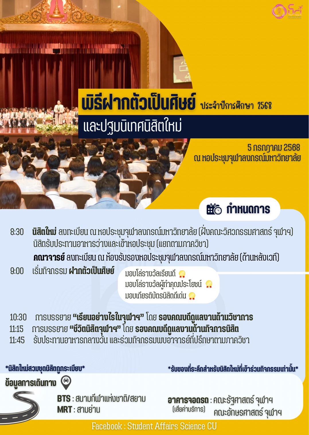 ขอเชิญนิสิตคณะวิทยาศาสตร์ ชั้นปีที่ 1 (รหัส 68) เข้าร่วมพิธีฝากตัวเป็นศิษย์ และปฐมนิเทศนิสิตใหม่ ประจำปีการศึกษา 2568 เวลา 8.30 น. และนิสิตใหม่พบอาจารย์ที่ปรึกษา ตามภาควิชา พร้อมรับประทานอาหารกลางวัน เวลา 11.45 น. ในวันที่ 5 กรฎาคม 2568 ณ หอประชุมจุฬาลงกรณ์มหาวิทยาลัย
