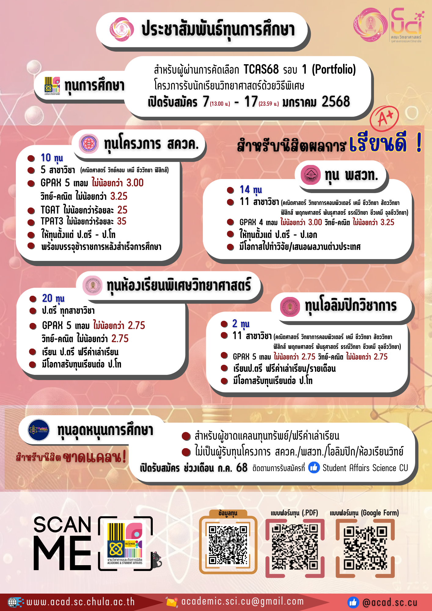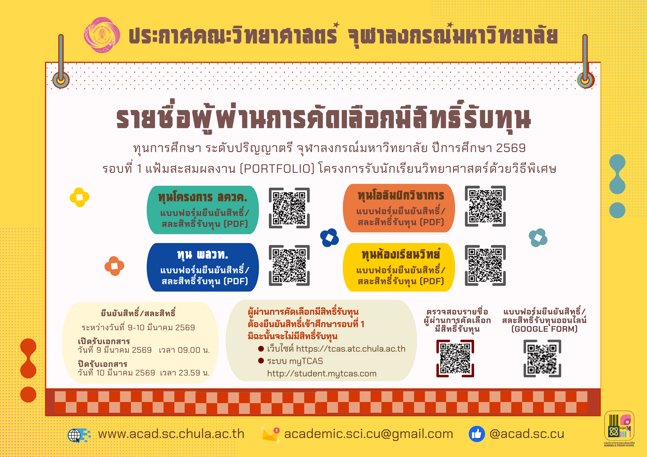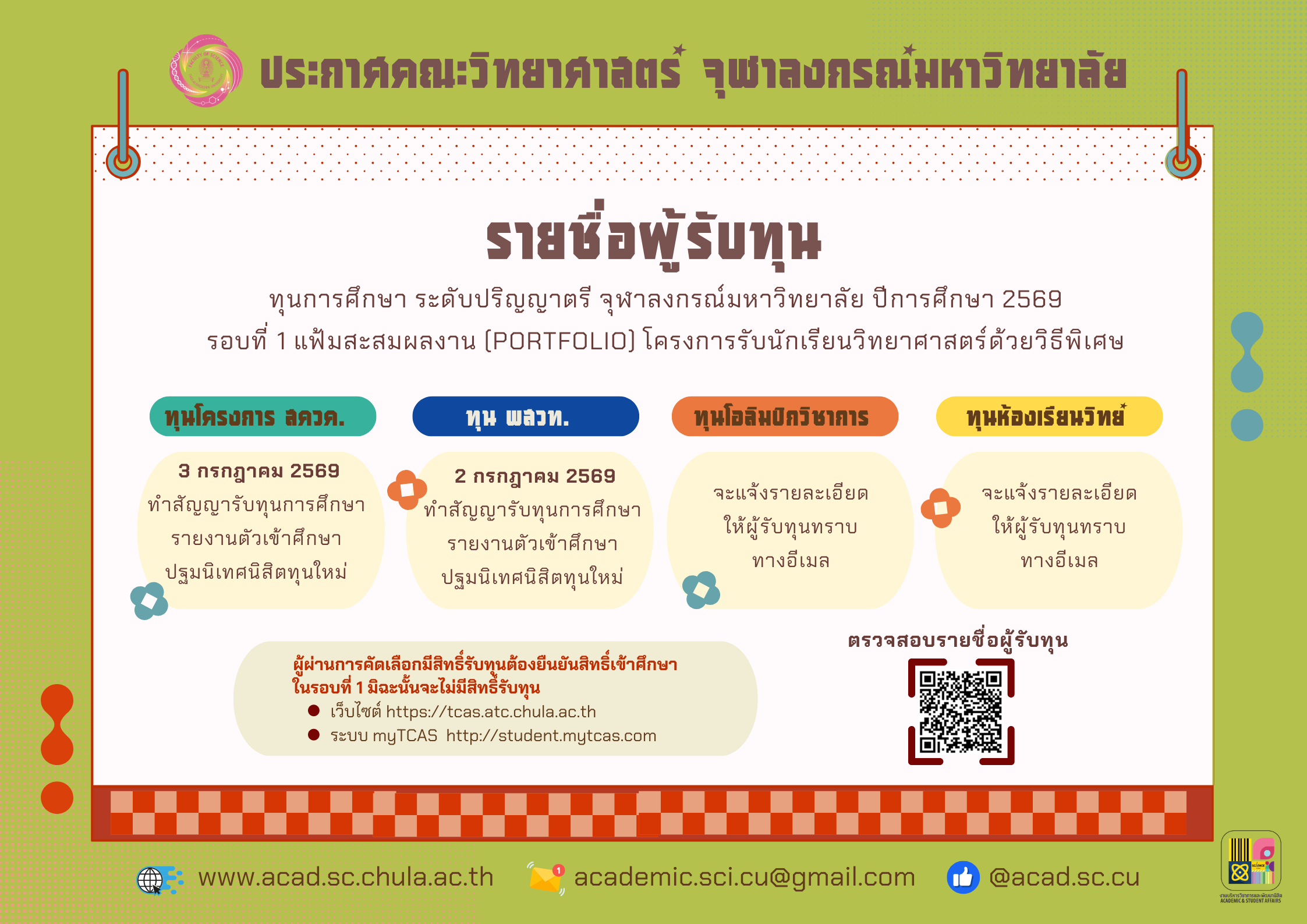 ประกาศคณะวิทยาศาสตร์ จุฬาลงกรณ์มหาวิทยาลัย รายชื่อผู้รับทุน สำหรับผู้ผ่านการคัดเลือก TCAS69 รอบ1 (Portfolio) โครงการรับนักเรียนวิทยาศาสตร์ด้วยวิธีพิเศษ