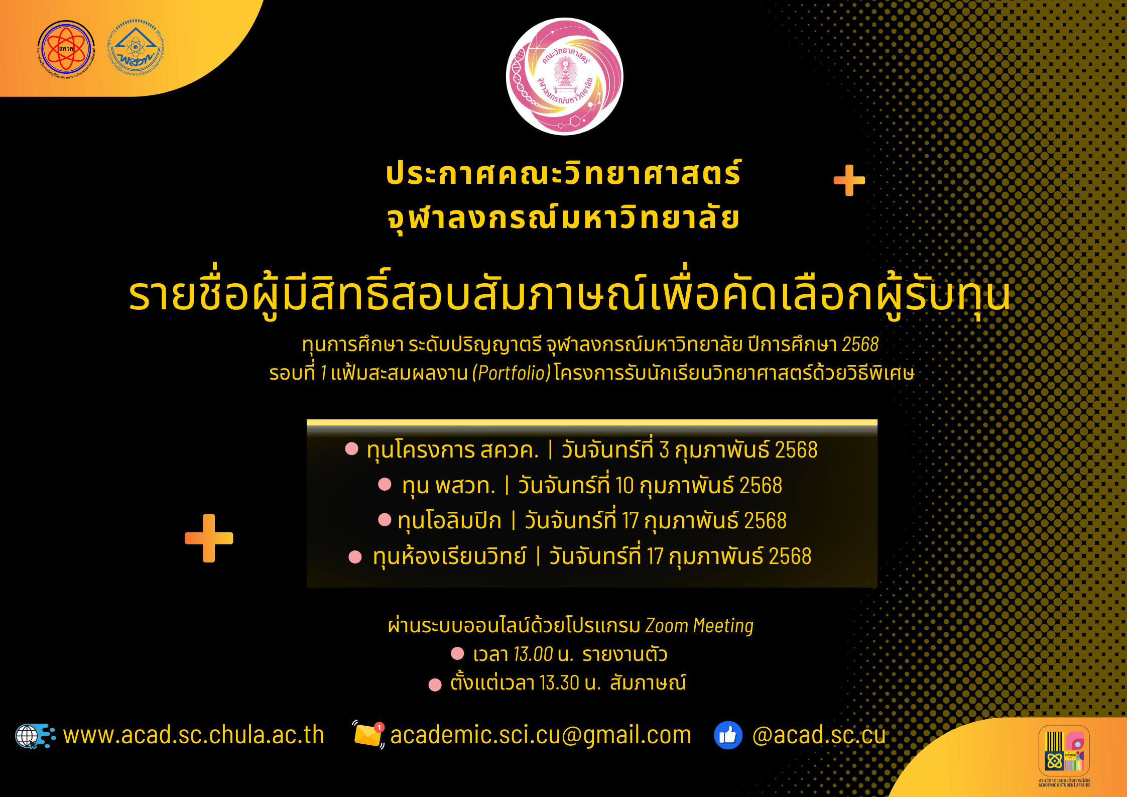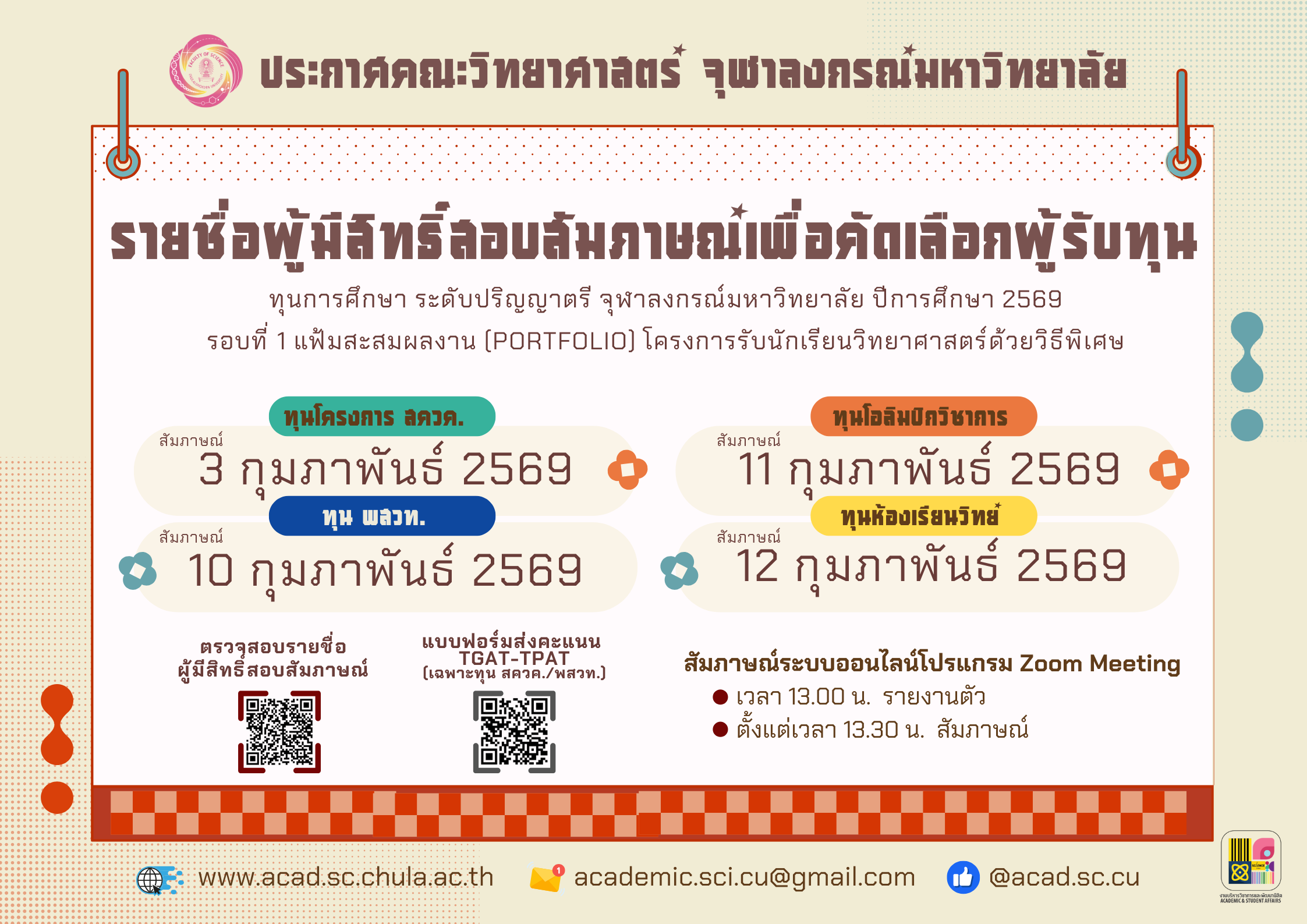 ประกาศคณะวิทยาศาสตร์ จุฬาลงกรณ์มหาวิทยาลัย เรื่อง รายชื่อผู้มีสิทธิ์สอบสัมภาษณ์เพื่อคัดเลือกผู้รับททุนการศึกษา ระดับปริญญาตรี จุฬาลงกรณ์มหาวิทยาลัย ปีการศึกษา 2568 รอบที่ 1 แฟ้มสะสมผลงาน (Portfolio) โครงการรับนักเรียนวิทยาศาสตร์ด้วยวิธีพิเศษ