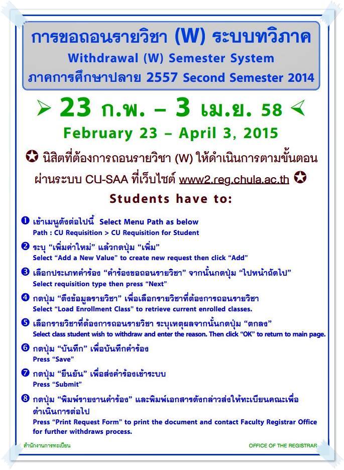 ข่าวประชาสัมพันธ์ การขอสำเร็จการศึกษา ระบบทวิภาค ภาคการศึกษาปลาย 2557 Method การขอสำเร็จการศึกษา ระบบทวิภาค ภาคการศึกษาปลาย 2557 กำหนดช่วงเวลา 23 ก.พ. - 3 เม.ย. 58 โดยดำเนินการตามขั้นตอนผ่านระบบ CU-SAA ที่เว็บไซต์ www2.reg.chula.ac.th ย้อนกลับ