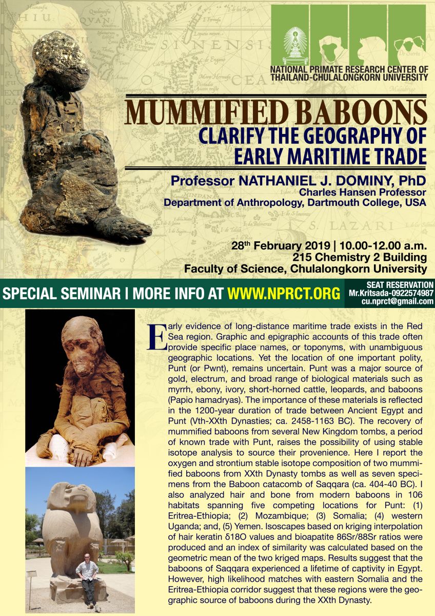 ข่าวประชาสัมพันธ์ ศูนย์วิจัยไพรเมทแห่งชาติ จุฬาฯ จัดสัมมนาพิเศษ หลักฐานมัมมี่ลิงบาบูน กับการค้าขายทางเรือในยุคแรก, Special Seminar: "Mummified baboons clarify the geography of early maritime trade” ย้อนกลับ