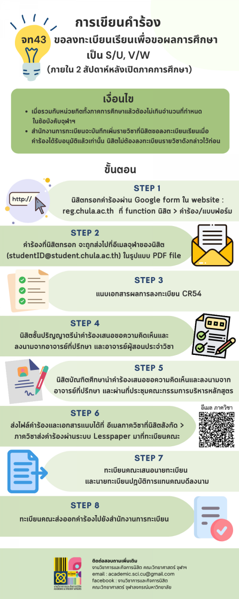 จท.43 คำร้องขอลงทะเบียนเรียนเพื่อขอผลการศึกษาเป็น S/U หรือ V/W | ขั้นตอนการส่งคำร้อง