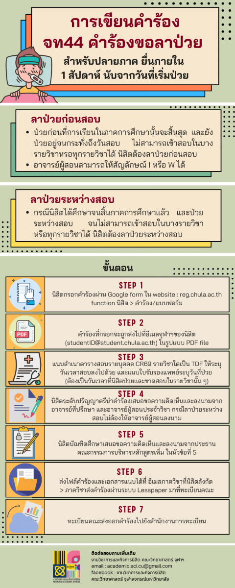 จท.44 คำร้องขอลาป่วย (สำหรับปลายภาค ยื่นภายใน 1 สัปดาห์ นับจากวันที่เริ่มป่วย) | ขั้นตอนการส่งคำร้อง